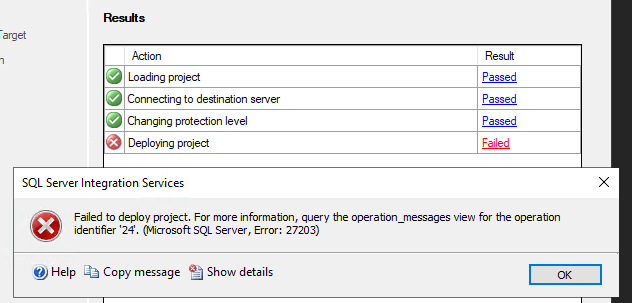 To prevent a load of almost the same screenshots, this happens when i deploy from SSDT, when i import from SSMS (SSISDB -> Folder -> Projects -> Import Packages) and even when i run the ISDeploymentWizard.exe from the commandline.