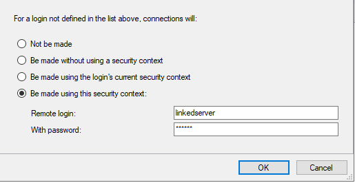 This resulted in the same error. Either the table doesn’t exist or there are insufficient rights. The next step for me was to check the configuration of the linked server. More specifically, the security. Because the account that’s used to set up the linked server needs rights on the server it’s linking to.