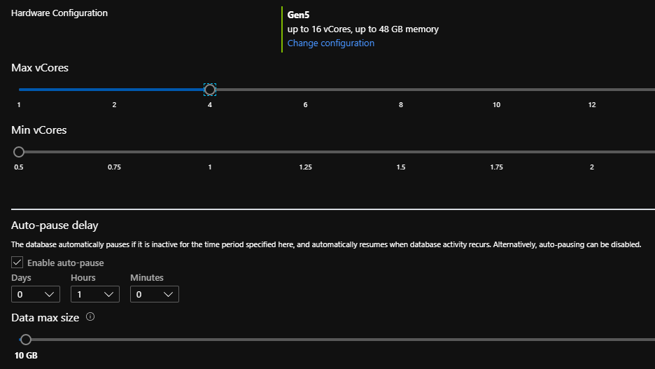 Now, i can change my provisioned database to a serverless database, and i can configure my vCores and automatic time-out. This will save money!