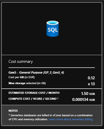 Suppose you just want a standard database that won’t grow really fast but you’d like some performance when you need it a few times during the day. Or you just want a database for some training purposes. Nothing fancy. You select the standard Edition, a size of 10 GB and a Server Objective of S4. Because it sounds nice, right?