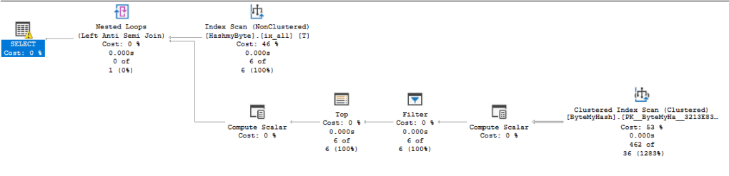 One of the things that is weird are the rowcounts. The ByteMyHash table contains 300 rows. But SQL seems to think it contains 462. The HashMyByte table contains 6 rows, for each row in this table, it needs to check the rows in the ByteMyHash table and get the fitting rows back. In a way, 6×6 = 36, this makes some sense. But the rest, right now, doesn’t. Update the statistics on this table? Did that, no effect whatsoever.