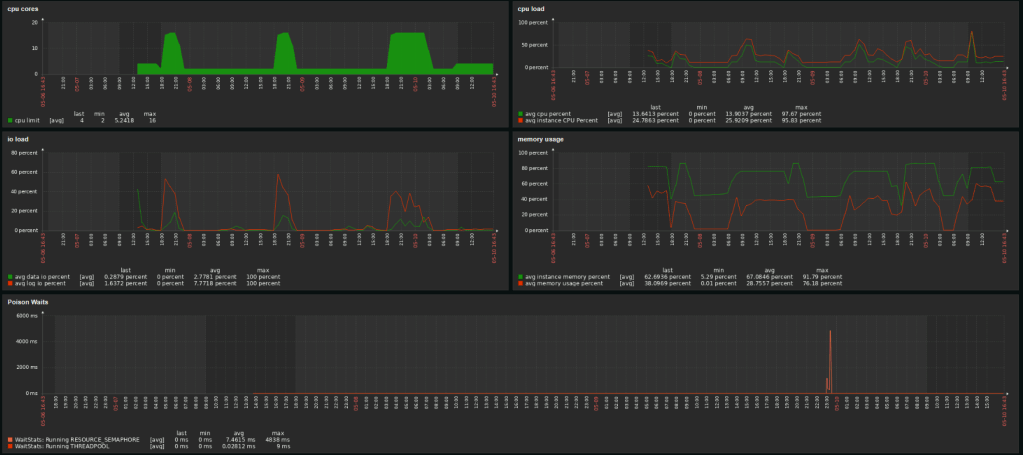 This dashboard will provide you with a more general overview of the database. The number of cores, the CPU load of both database and instance, the IO load and the memory usage. Keen viewers will see a drop in memory usage when the database scales. Well spotted! When a database scales (up or down) it will free up the bufferpool. Something I wasn’t hoping to see is one of the poison waits: Resource_Semaphore. The instance ran out of memory. Not good and something that needs some extra investigation. In any case, I need to add an alert for that.