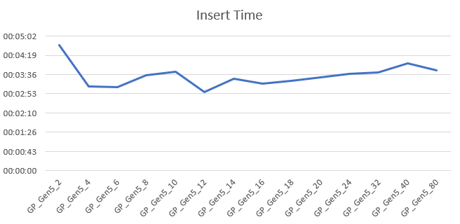 After inserting data, it was time to select some. The script that I’ve used is intentionally horrible to make the worst of the performance. The 2 core DB took 16,5 hours to complete. Just like the inserts, you can see enormous increases at the low end but the more you increase, you get less extra performance. The 80 core SKU finished in just over 22 minutes. Like the previous graph, the more cores you add, the less extra performance is gained. But every core added does increase performance. Every time we double the amount of cores, the time needed to complete is halved. That’s quite impressive to be honest, because there hasn’t been any tuning and the runs are always fresh; no cached plans for example.