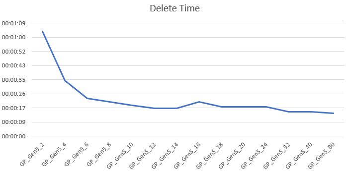 After selecting data I decided I had enough of the large amount and had to trim some of. So I deleted 300.000 records. This process is quick all over the board, ranging from a little under 1 minute for the 2 core SKU minutes to 14 seconds at best. The gains from 6 cores and up were very little as you can see in the graph. Just like the DTU tiers, at some point adding more cores doesn’t really help anymore.