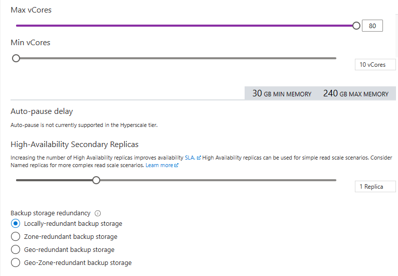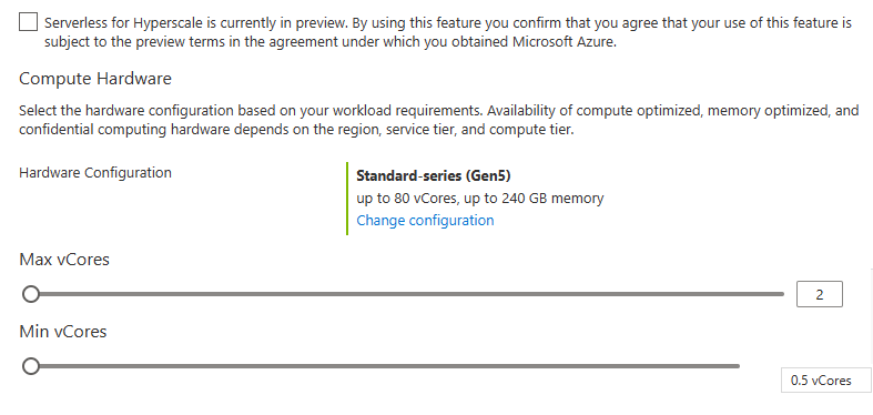 These are familiar sliders. We have the Min and Max vCores settings as seen from the General purpose serverless offering. Let’s see what the min does when sliding the max.