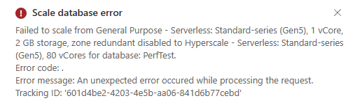 As it’s in preview, it can be expected. And, maybe my MCT subscription can’t handle this. So let’s be a bit more modest and go for 16 cores. Something we’re using this SKU in client solutions.The deployment errored again. As I was changing an existing database, I changed tactics and deployed a new one, with 16 cores.