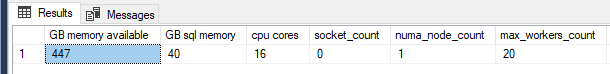 16 cores, 40 GB of memory on 1 numa node. 20 workers max, 16 schedulers. Seems allright.