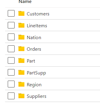 The TPC-H dataset has 8 different tables, pictured here as folders: