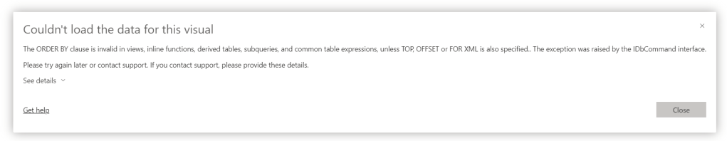 So I changed the query to get rid of the ordering and tried again to create a visual.