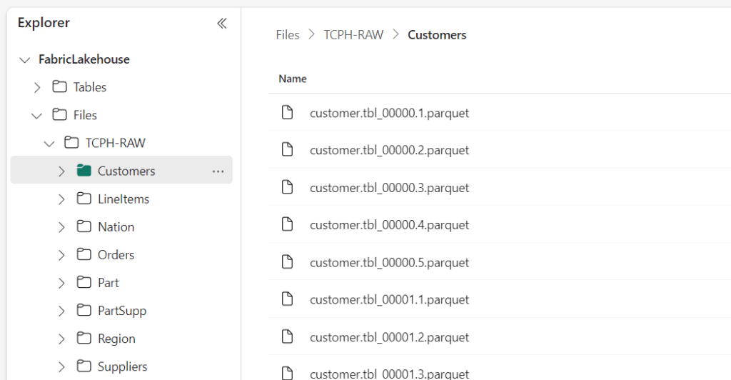 As the dataset had already been transformed to parquet files I could pick these up quite easily and write them to my Onelake as well. This wasn’t just one file but all of the generated files from my TPC-H test setup.