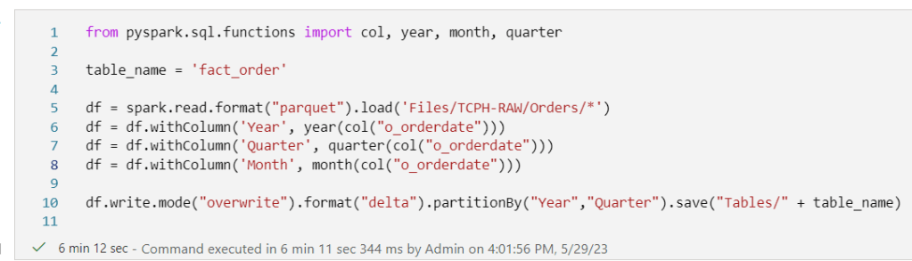 dforderline.write.mode("overwrite").format("delta").partitionBy("Year","Quarter").save("Tables/" + table_name)