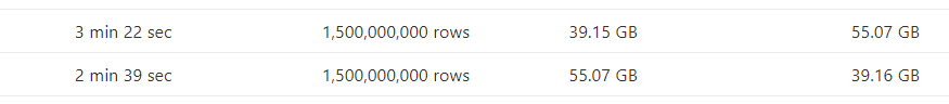 You can imagine the content of these tables. There is referential integrity between the tables but the information in the tables is completely random. Just some weird strings and numbers. The CSV size was about 520 GB, the parquet size is 263 GB. A lot smaller though not as much as I expected when transforming the data. Then again, splitting over 4335 files might not have been the most brilliant idea.