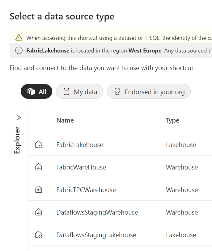 When you click on new shortcut, there are three options, OneLake, ADLS Gen 2 and Amazon S3. This is because these options allow for the storage of Parquet (in delta format). Right now, other sources, like a SQL Server table, are unavailable. Should they be there? I can see use cases but also a security nightmare. In my case, I want to create a shortcut from my Warehouse to my Lakehouse. Both are in my OneLake.