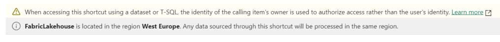 When I click the OneLake button, two warnings appear. The first one telling me that it’s the calling item’s identity authorising the data I’m allowed to see, not the user I’m logged in with. In other words, no matter my authorisation on the data, if the application has full rights on the table, I can see all the data. This feels a bit weird and like an old way to build applications. As I’m working on Azure with all its Azure AD goodies, I want to leverage that when it comes to data security.