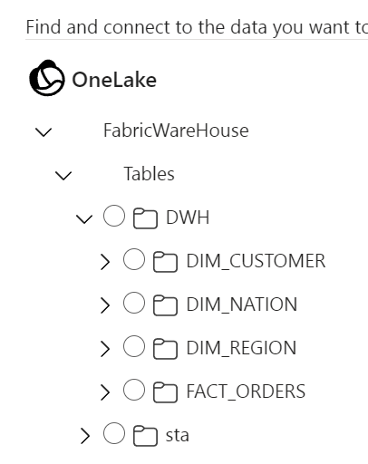 Alright, I’ve got my list of warehouses to choose from. I’m selecting my FabricWareHouse to add a table to my FabricLakeHouse.