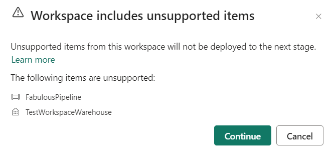 As you can see from the screenshot above, a pipeline isn’t supported and doesn’t show up. When you unassign a workspace and reconnect it, you’ll get a warning for this: