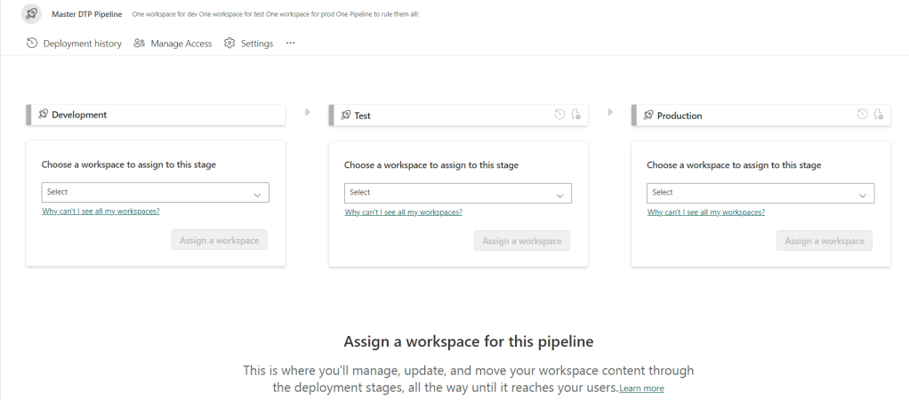 When you’ve created it, you get the option to join the workspaces to the pipeline stages or steps or however you wish to call them.
