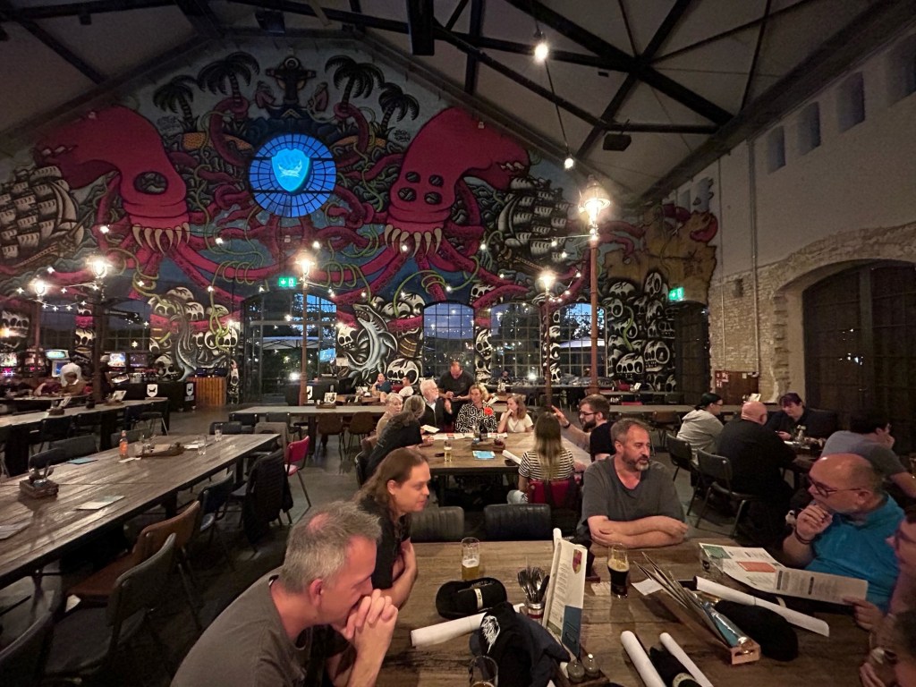 Travelling to Berlin was easy by plane (for some reason the railways made it hard to plan) and after a short walk and ride with the U-bahn I got to the speaker dinner. A lovely place with beer and burgers. We got our speaker shirts there and the accompanying poster. Again, the organisers went two steps further by keeping it in the theme. The shirt is really like a concert shirt with the speaker names on the back, in the font of their preferred bands. The poster resembles this as well.