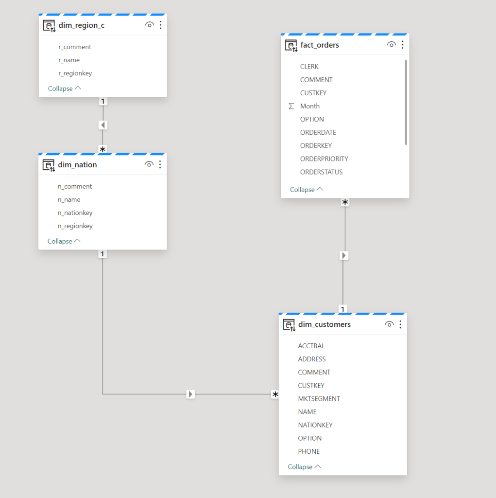 Now, before you go off and create your report, what you need to do is create a semantic model. This is like the Entity Relational Diagram or (SAP) Business Objects Universe of your tables. Not all the tables, just the ones you need for the report or domain or use case. To keep it understandable, I’ve created a small model for my report.