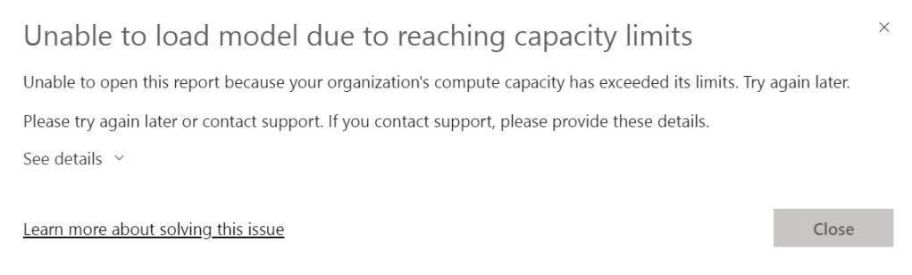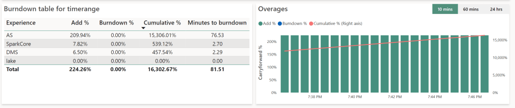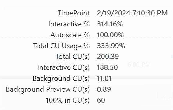 I have 60 CU(s) at my disposal and for the report needed 188 CU(s). Or a little over three times what I have at my current disposal. PowerBI tried as hard as it could, now showing stale information until you try to refresh it. Then the message appears telling you the capacity is blocking everything. I imagine it laying flat on its face hoping this too shall pass.