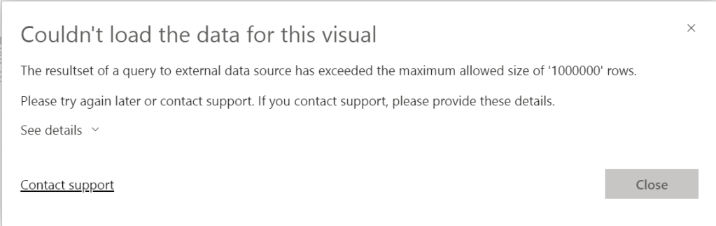 It seems I’m not allowed to load over 1.000.000 rows into my report from an external resource, even though my resource is a Lakehouse. Well, I was only trying to load 750.000.000 rows into this one so fair enough. Moreover, what I wanted to do was show a row count, but that clearly failed :D. Funny thing is, with DirectLake mode, you can’t add columns to the dataset or change the datatype. I found this one out whilst trying to convert a string datatype to an integer to be able to use an aggregation on the report. If you weren’t aware already, note that datatypes matter, even more in your lakehouse. Well, moving on.