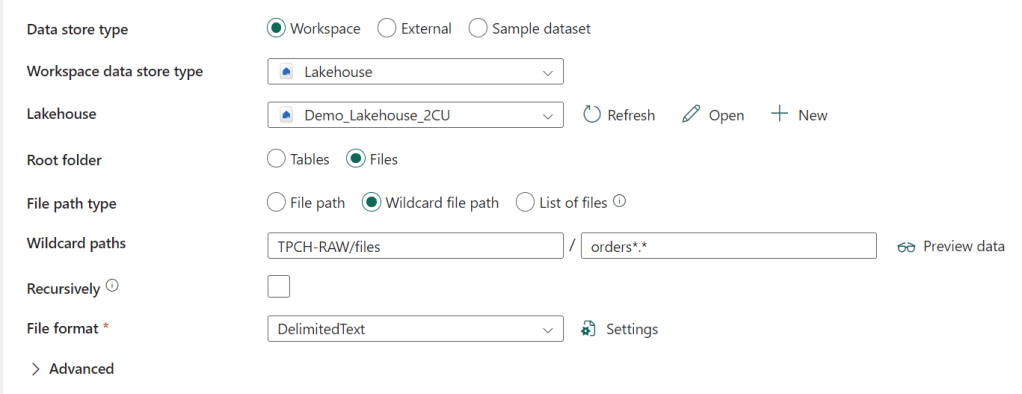 I’m using a wildcard to read the multiple orders files from the Lakehouse. The file format is delimited text: