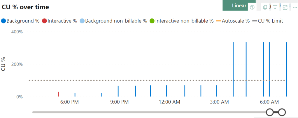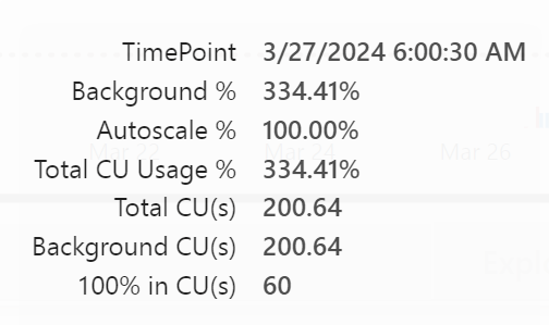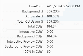 The first time I ran this query it went a little over the capacity but not all that much. But, doing that for a little over an hour does build up some overage that, as I found out, kept on building. But as these results were a bit weird and inconclusive, I ran the query again (and again) as requested by the Fabric Team to see what’s happening.