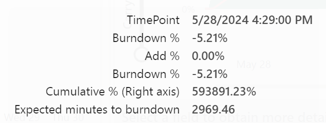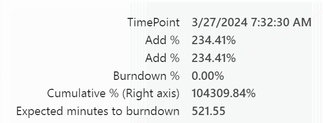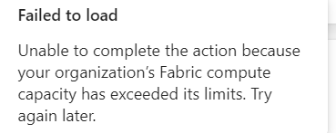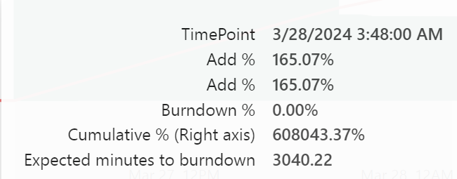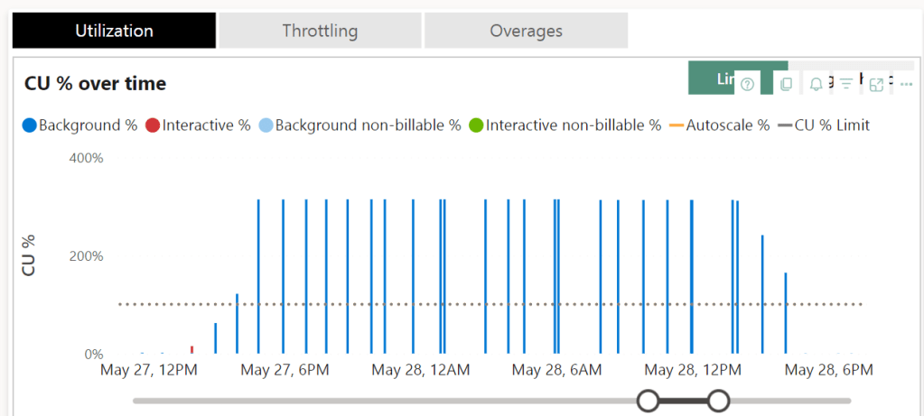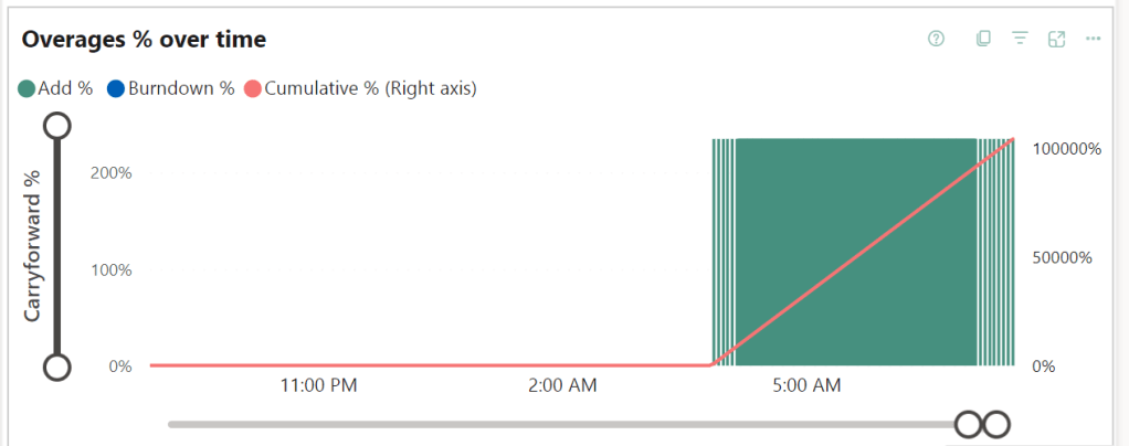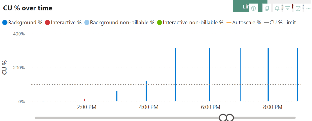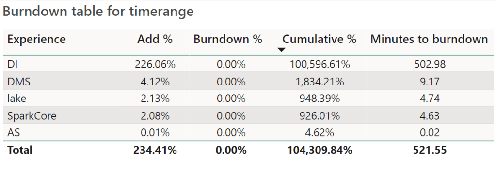 This screenshot shows the maximum point of my overage usage, leading to 50 hours of burn down after 24 hours of overage use. The net result is a Fabric capacity that is rendered useless for more than 3 days. This should be a signal that you’ve under provisioned your capacity and should increase the SKU. Nothing else. This really is just an example to show you how to test the limits. With an F8, the issue would have been way less or maybe even non-existent.