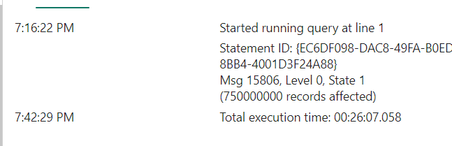 750 million rows in 47 minutes and 18 seconds. This translates to 258.888 records per second. That’s not bad at all! I’ve seen demos where inserting a few records takes seconds, but it seems the engine needs to warm up a bit because this isn’t bad at all! Although for comparison, the lake house notebook processed 120 million rows in 2 minutes and 28 seconds on the same F2 capacity, a performance of 810.810 records per second, a little over three times quicker.