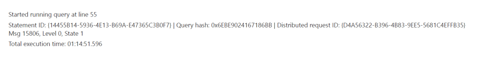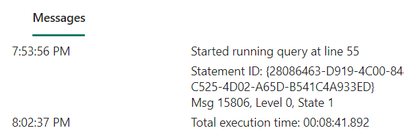 The funny thing is, the query finished ok it seems, but there’s no row count. When editing the query window in Fabric, this message shows up.