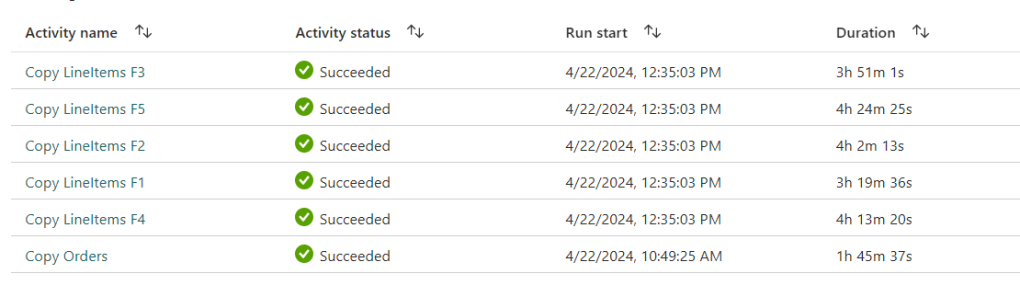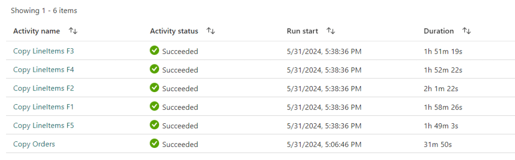 So yeah, using an F8 worked to get all the data across; 1 hour 45 minutes for the Orders and 4 hours 24 minutes in total to process all the LineItems coming to a grand total of 6 hours and 10 minutes to move the CSV Files into the Warehouse with a pipeline. As a side note, the F2 capacity finished transforming the files from CSV to Parquet in a Notebook after 2 hours and 5 minutes.
