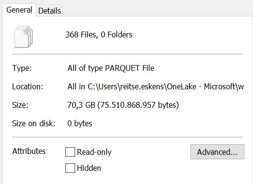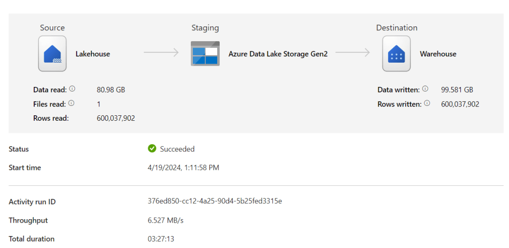 The funny thing is, from reading 90 GB of flat text data, the process wrote 103 GB of data. It created 368 files of about 200 MB in data. Instead of using compression (like the lakehouse does with the v-ordering, it looks like the ware house doesn’t do this.