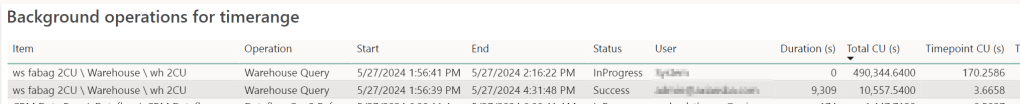 You might see something like this, after sorting the table. One operation in progress taking an immense amount of CU’s. Though with different timestamps and, when I checked on a different time, the result in the metrics app is identical. Which is weird. My gut feeling is that I’m doing so many weird things to the capacity that the capacity metrics app loses track as well.