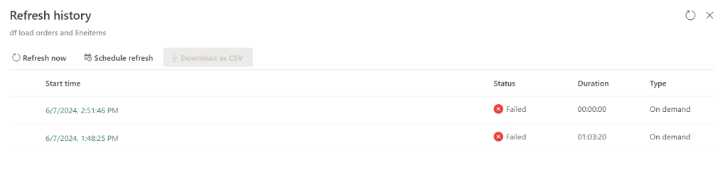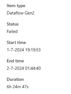 Now we get into an area where there’s a vast difference. The dataflow Gen2 finished in 10 minutes. Whereas the non Fast Copy one failed after six hours. Read that again, 10 minutes success versus 6 hours failure.