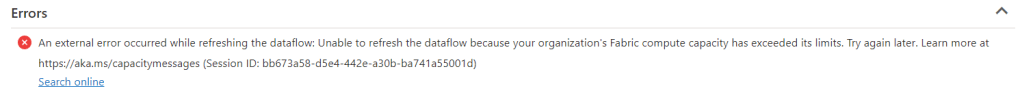 What you’re seeing here is that the load registered from the dataflow gen2 is slowly growing. It starts quite small and keeps increasing. Now the hard thing is that I can’t see what it has done and what it hasn’t done. It’s a bit of a black box that succeeds or fails. And with just the mention “you ran out of capacity”, it makes it very hard to debug.