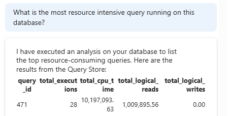 Something very interesting is resource intensive queries. I’ve been running some silly stuff against my data, just to see what happens. The question sent to Copilot is what the most resource intensive query is. Now resource intensive is a bit of a generalisation because what does it mean? CPU, Memory, IO or all of these? Let’s see.