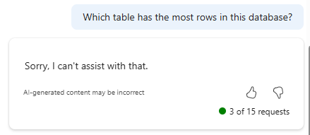 Now this raises some questions. Is Copilot unable to rewrite queries, or is it impossible from this specific Copilot. As you noticed at the top of this blog, Copilot in the Azure portal has a limited number of options it can go through; for instance it can’t touch your data. I’ll revisit this question in the next blogpost. Let’s try and find out what it can do with the data in your database.