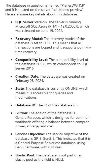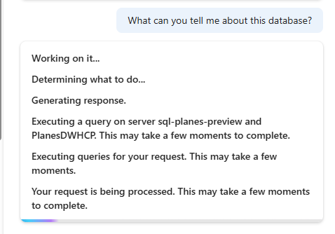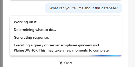 Having found Copilot, it’s very easy to write one question into a chat screen and get a response. Something like ‘what can you tell me about this database?’. And after some thinking, you’ll get a reply that shows you information on the database.
