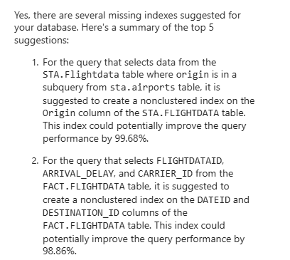 I’ve had many different experiences with adding non-clustered indexes on top of clustered columnstore indexes. But this isn’t Copilots ‘fault’, it checks for missing indexes and returns a result. When you check the query it used, it will go to the missing indexes dynamic management view among a number of Query Store tables.