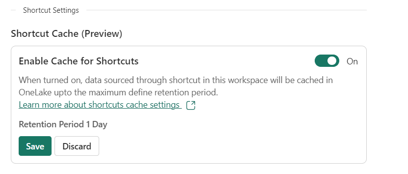 The final option for caching of shortcuts, for now, only applies to GCS, S3 and S3 compatible shortcuts. The idea is that you keep the data read from those non-Azure data sources in cache to prevent data transfer between providers every time the data is requested.