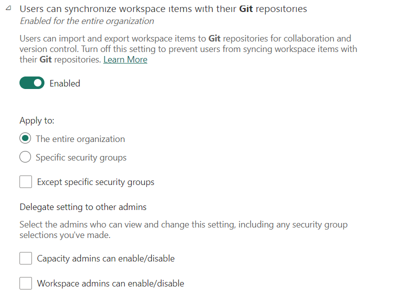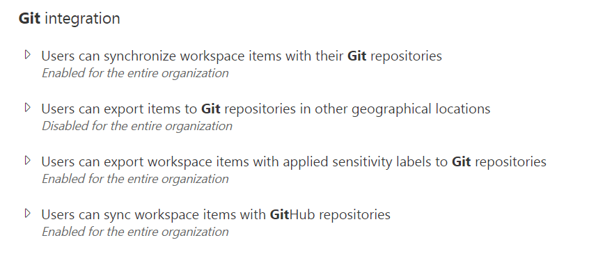 You can set a few things here. These settings are self-explanatory so let’s not get into these too much. The tricky part is the first sentence; users can synchronise workspace items with their Git repositories. This implies that it can be any git repository. And that is correct, as long as it’s a Github or Azure DevOps one. So make sure that not everyone can do this as you don’t want just any repository to be connected to your Fabric environment. Click here for the documentation.