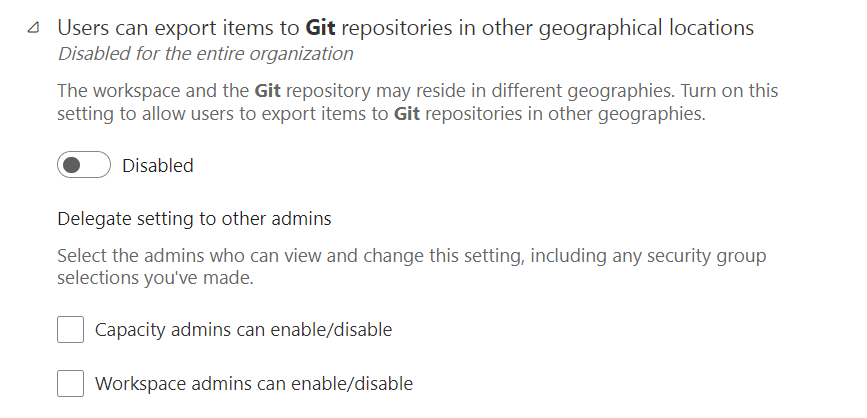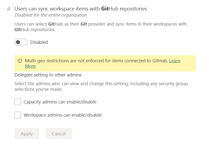 In other words, if you have an item with a sensitivity label attached to it, for instance HR, and this setting is disabled, this item will not be taken into account when synchronising your workspace with Git. If you enable this setting, you can synchronise it but the label won’t be synchronised. This means that when you create a new workspace and pull the items in from Git, you will have to apply the labels again. In cases like this, you can also look into promotion pipelines.