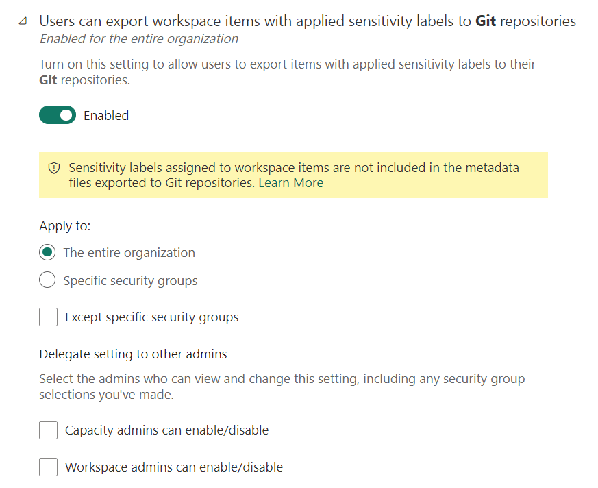 This option isn’t exactly clear in it’s wording. If you read the entire screenshot, you’ll deduce that this setting allows resource that have a sensitivity label applied to them to be exported to Git repositories, but it will lose the label in transit.