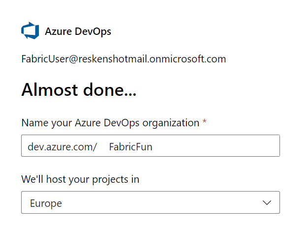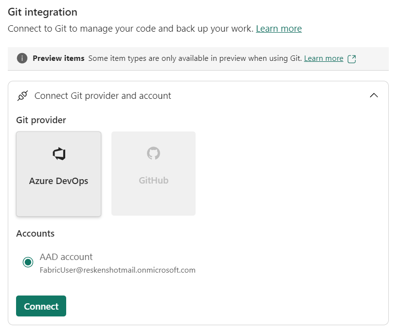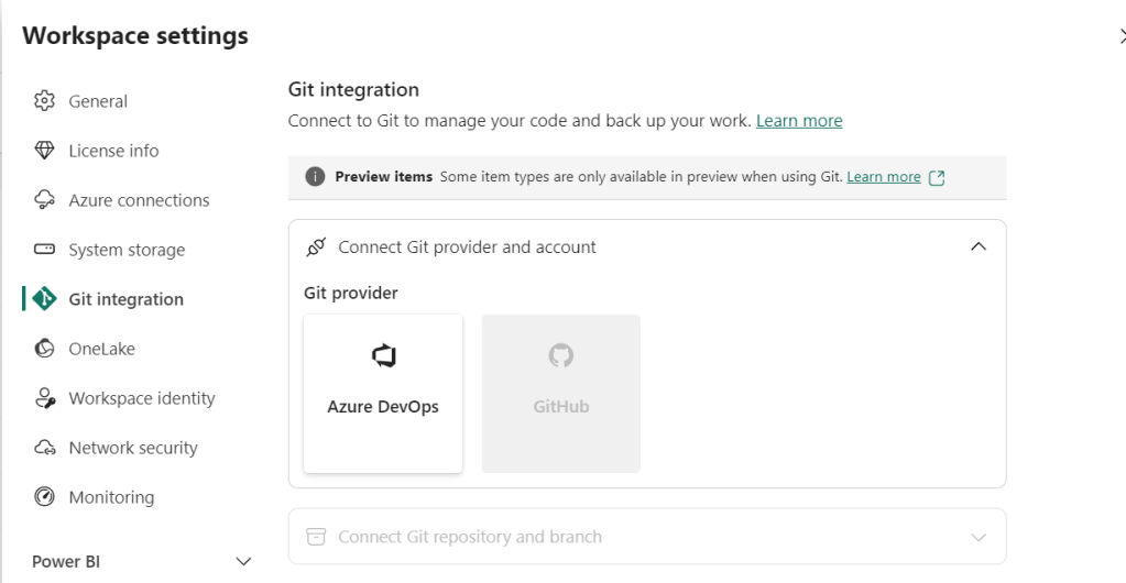 As the Fabric admin disabled Github, it’s not possible to connect to Github in this example, I’m only allowed to connect to Azure DevOps.