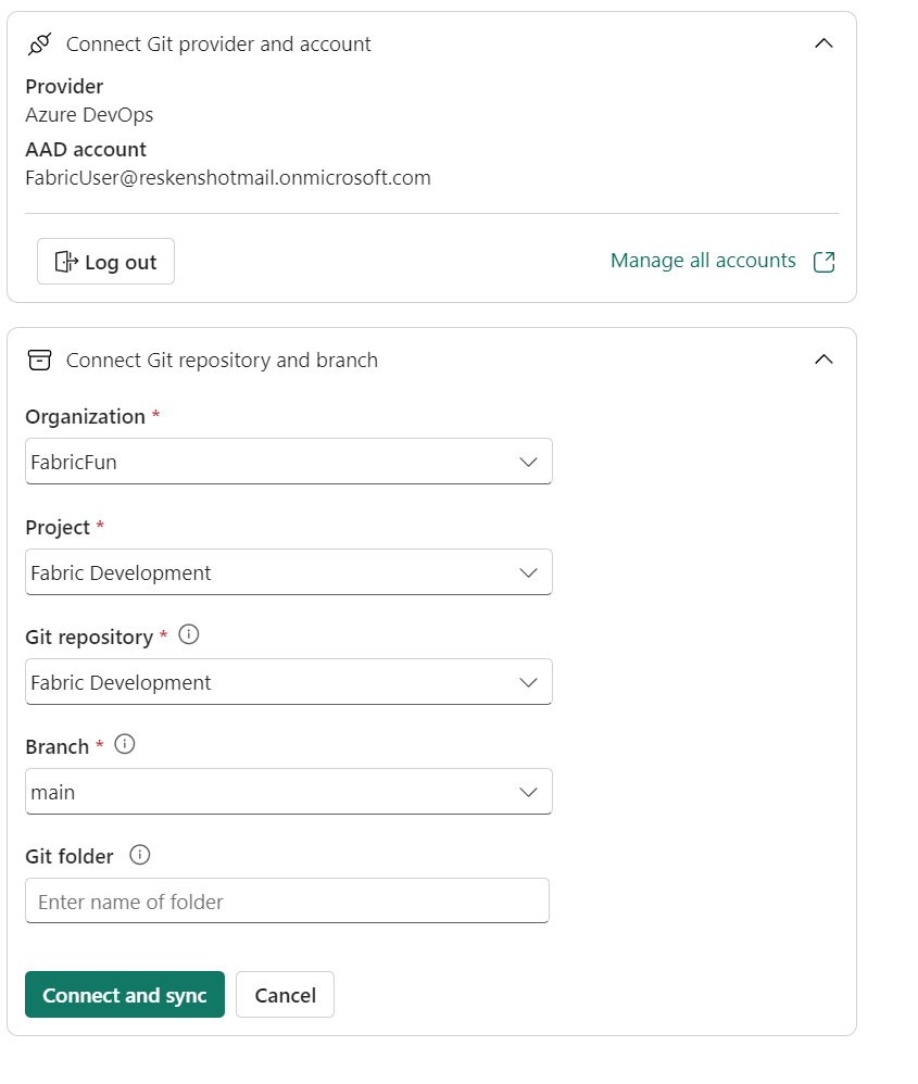 After you connected with Azure DevOps, you need to choose the Organisation, followed by the project, the git repository in that project and finally the branch. The Git folder is optional and can be left blank.