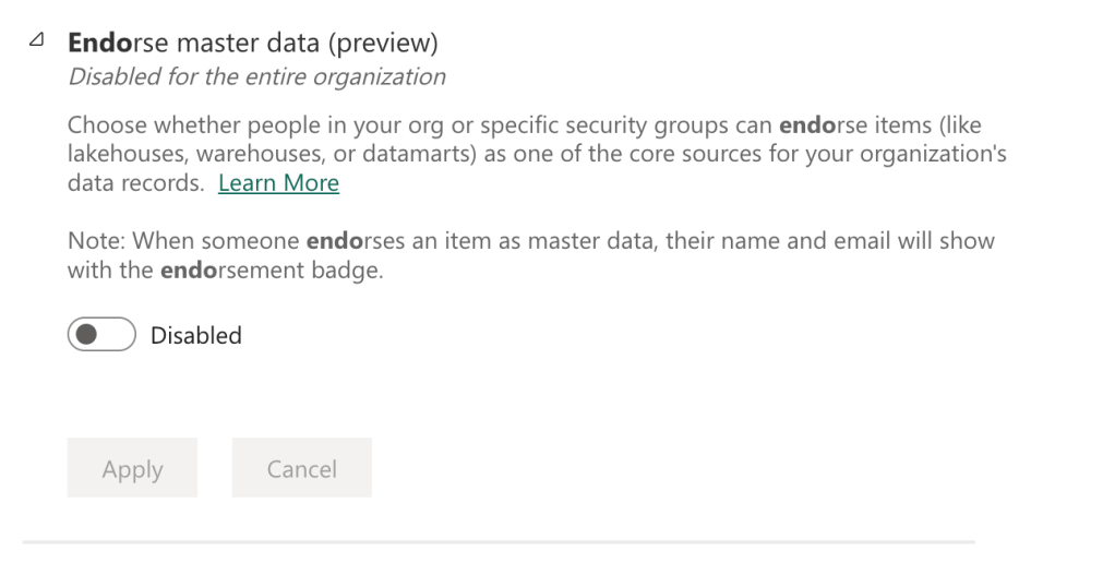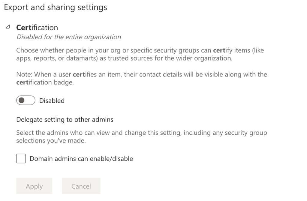 This label is a level up. Not only is this showing the item is very good, it also shows that it abides company standards. Because of this, not everyone can apply the certified label. First, it needs to be enabled in the admin portal of Fabric. Then I’d strongly urge you to let only a subset of people have access to applying the certified label. Make sure that this label has value.