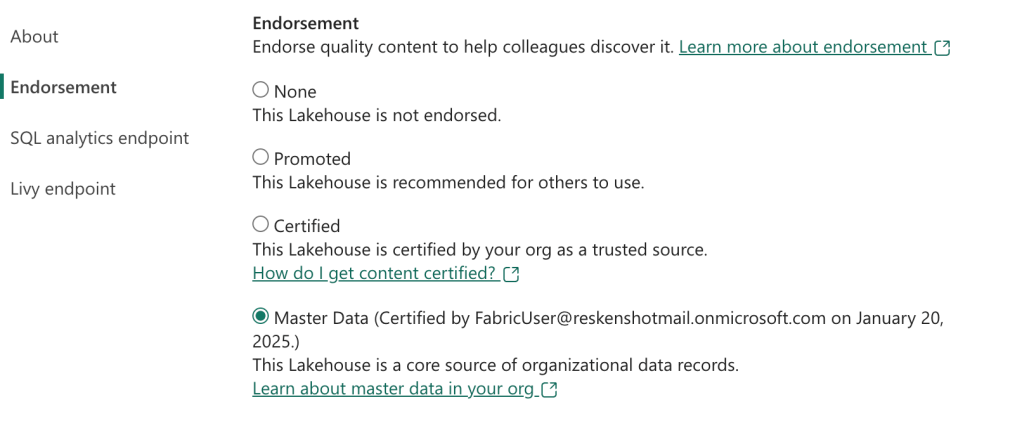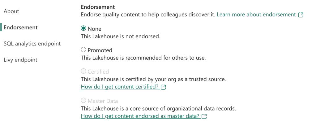 If you do not have the permission to certify an item, there should be a link visible helping you to documentation how you can get your item certified. When the administrators haven’t created a webpage with steps how to achieve this, you will be redirected to the standard Microsoft Learn page on endorsement of items. In that case you’ll need to contact another human in your organisation.