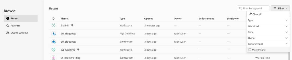 On the left sidebar in the Fabric portal, there’s a browse button. Click this and you will see a screen filled with all the items from all the workspaces you have access to. Real fun, but now that you start applying labels, you can use it as a filter too.