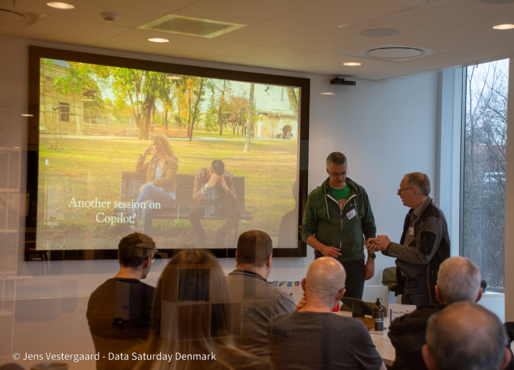As I had the first session of the day, I chose to go to my session room directly after breakfast. Reason being that an Apple computer can sometimes be less cooperative with beamers. This time, the only issues I ran into were a protesting clicker and my browser refusing to accept a click on the Copilot button. Because the main tech worked, I forgot to check of these two steps. Ah well, I’m only human.