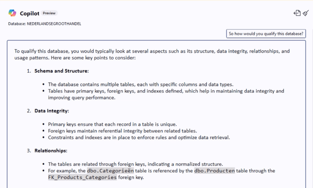 Well, as you might have seen from other blog posts, I’ve been playing around with SQL Copilot for quite some time—I think it’s more than a year now. I started with Azure SQL Copilot in the Azure portal and the query editor. Then, I was allowed to test the SSMS Copilot integration. I’ve seen it grow from an addition that could be right to an excellent assistant giving great answers.